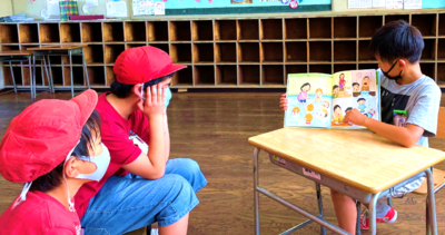 今日のにこにこタイムは「あじさい読書集会」でした。にこにこ班の高学年が下級生に絵本や、紙芝居の読み聞かせをしました。「みんなが笑いながら聞いてくれて、うれしかった」と喜ぶ高学年の姿が印象的でした。