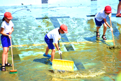 7月1日(木)、プール清掃を行いました。1年間使わなかったプールは苔や泥がこびりつき、お世辞にもきれいとは言えない状態でしたが、子どもたちはもくもくと楽しそうにブラシやたわしを使ってゴシゴシこすっていました。ピカピカになったプールで今年も水泳授業ができないのは残念ですが、強い日差しの中、時にはわざと水を浴びながら一生懸命頑張った子どもたちの表情は、満足感に溢れていました。