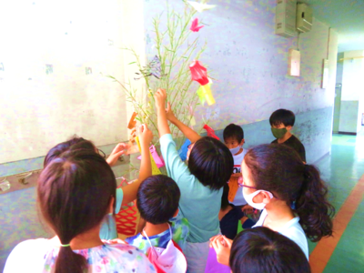 各学級で願い事を書いた短冊や折り紙で作った飾りを笹竹に飾りました。みんなの願い事が叶いますように!