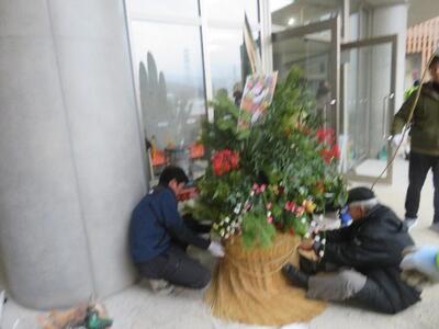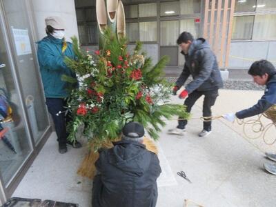 つばさっ子ボランティアの皆様のお力をお借りし、今年も児童玄関の外に立派な門松ができ上がり、新年に子どもたちを迎え入れる準備が整いました。できたばかりの新校舎を彩ってくれています。